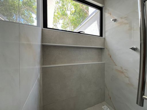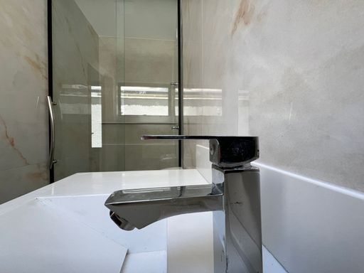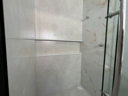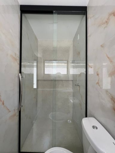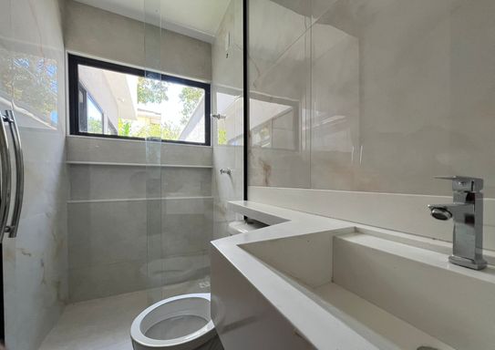Banheiro social com bancada em prime branco, nicho contínuo e box blindex piso-teto, trazendo um visual limpo e sofisticado.