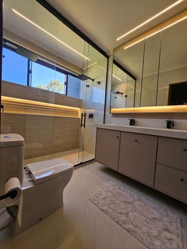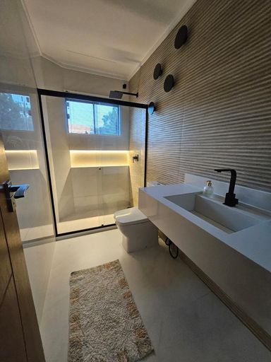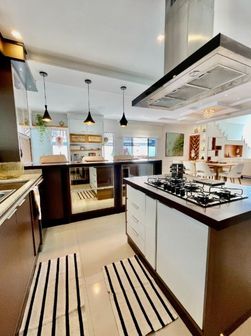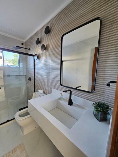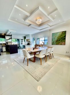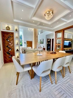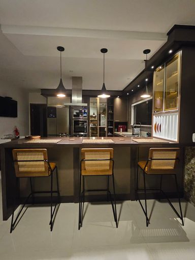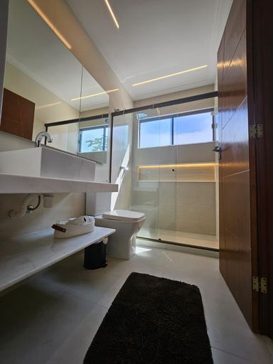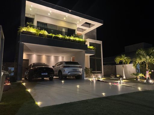 A cozinha é integrada, com balcão e ilha em granito, armários planejados, cooktop e coifa, unindo funcionalidade e sofisticação. Toda a casa possui iluminação indireta e rebaixamento em gesso, valorizando ainda mais o projeto arquitetônico.