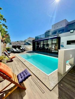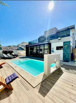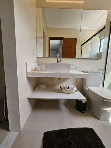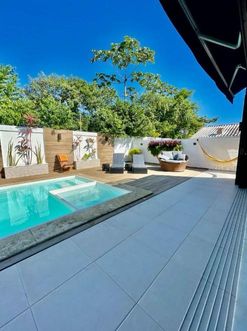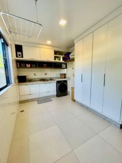 Na área externa, o imóvel dispõe de um quintal espaçoso com churrasqueira, chuveirão e uma piscina automatizada com cascata, perfeita para momentos de lazer e confraternização. A área de serviço é ampla e funcional, e a garagem comporta até 4 veículos.